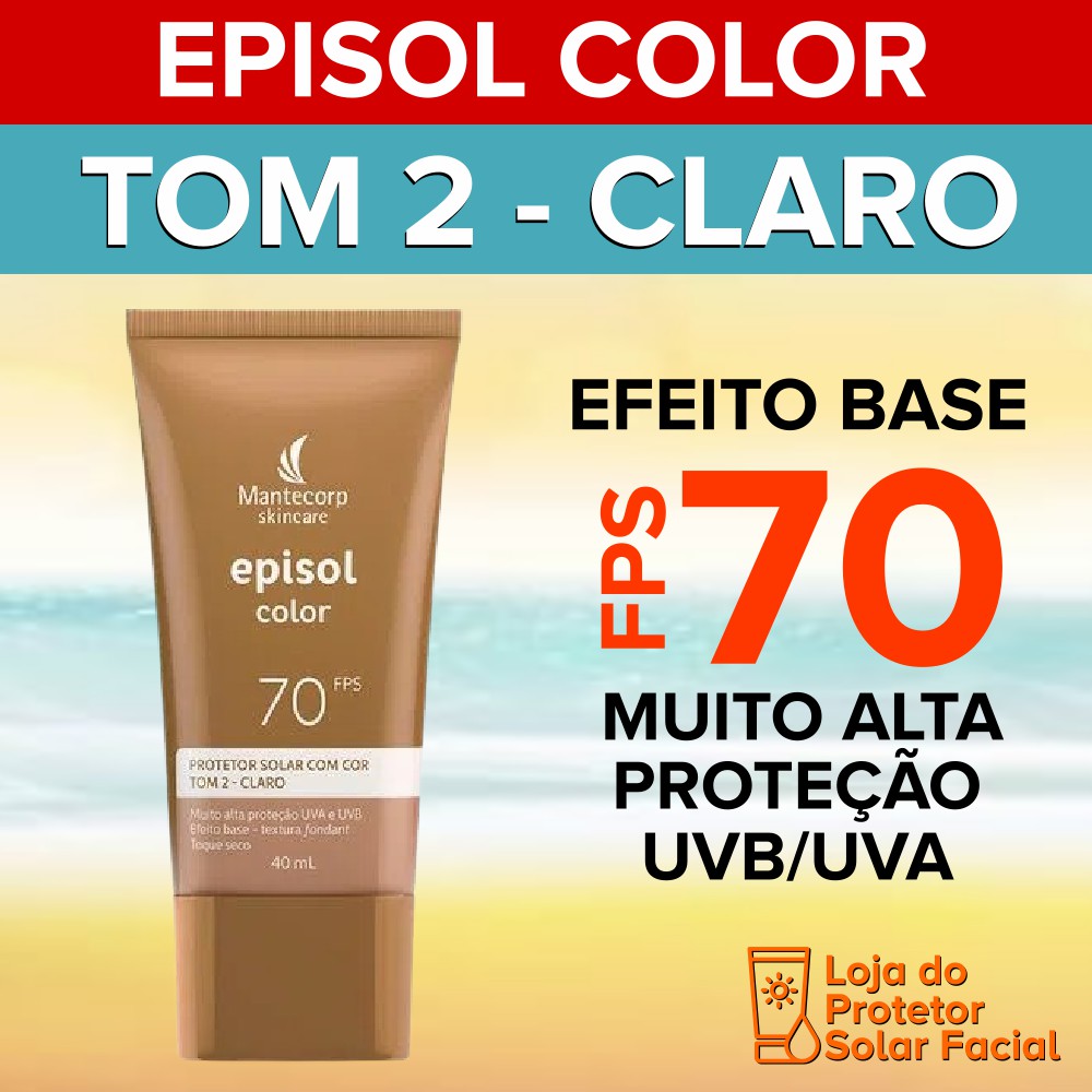 O Episol Color FPS 70 | Tom 2 - Claro é um protetor solar com cor, desenvolvido especialmente para proporcionar alta proteção contra os raios UVA/UVB, disfarçar imperfeições da pele e controlar a oleosidade com acabamento seco e toque aveludado.